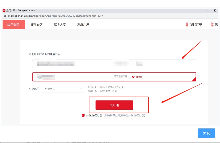 1.3、进入畅捷通应用市场页面,点击“可开通的产品”,点击“去开通”,显示“授权成功”,即账户已经成功授权