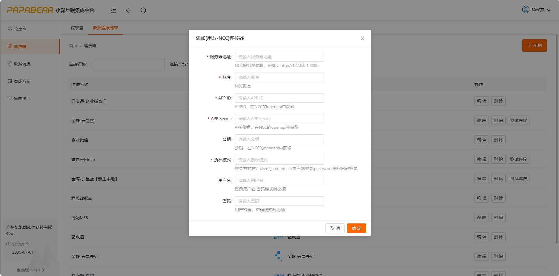 1、用友NCC在小懿互联授权账号需要【服务器地址】、【账套】、【APPID】和【AppSecret】、【授权模式】5项信息,请联系用友NCC人员获取,填入到小懿互联点击下确定即可授权成功。