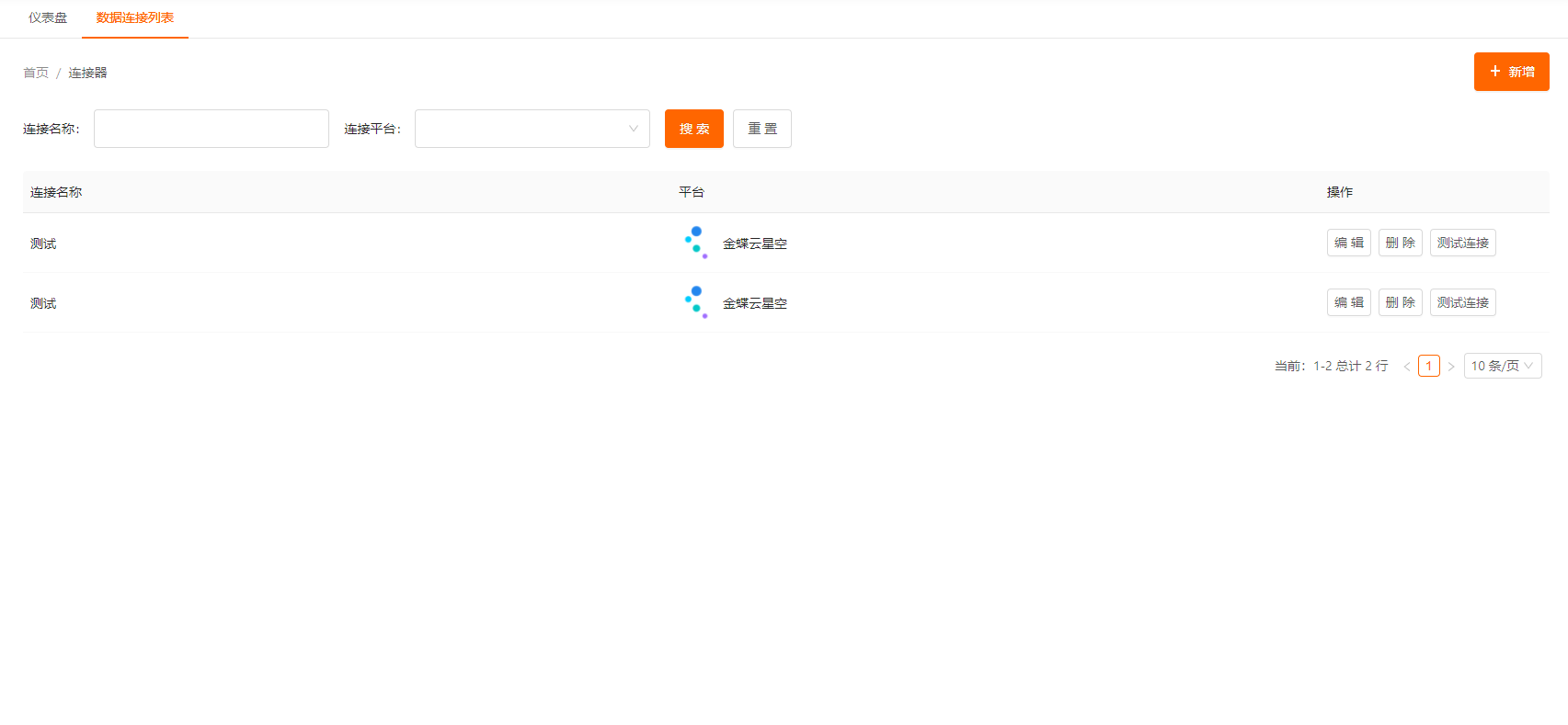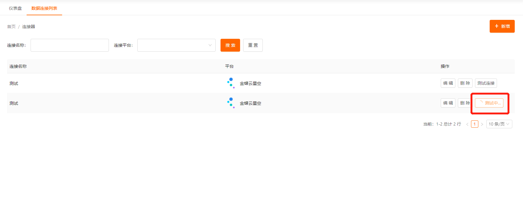 在连接的管理页面点击连接器右侧的“测试连接”按钮,可进行测试连接,如参数输入正确则会显示“连接成功”。