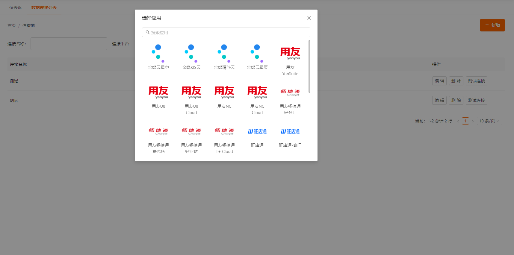 - 点击右上角的新增按钮,选择需要连接的系统