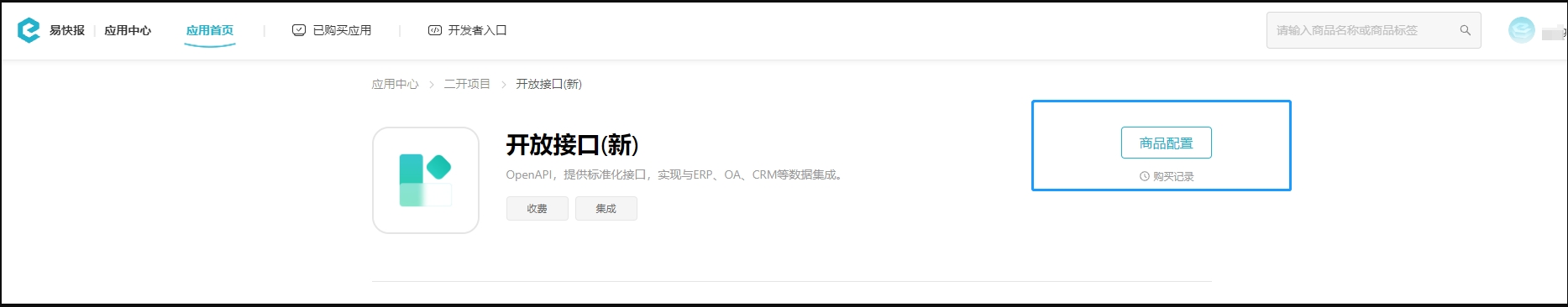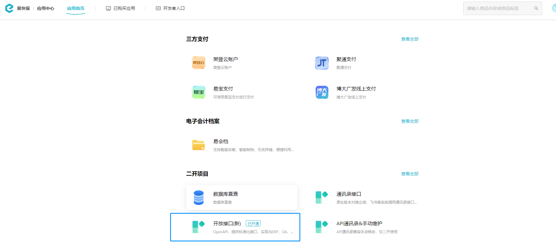 1.2、登录后,在易快报应用首页【二开项目】选择【开放接口(新)】