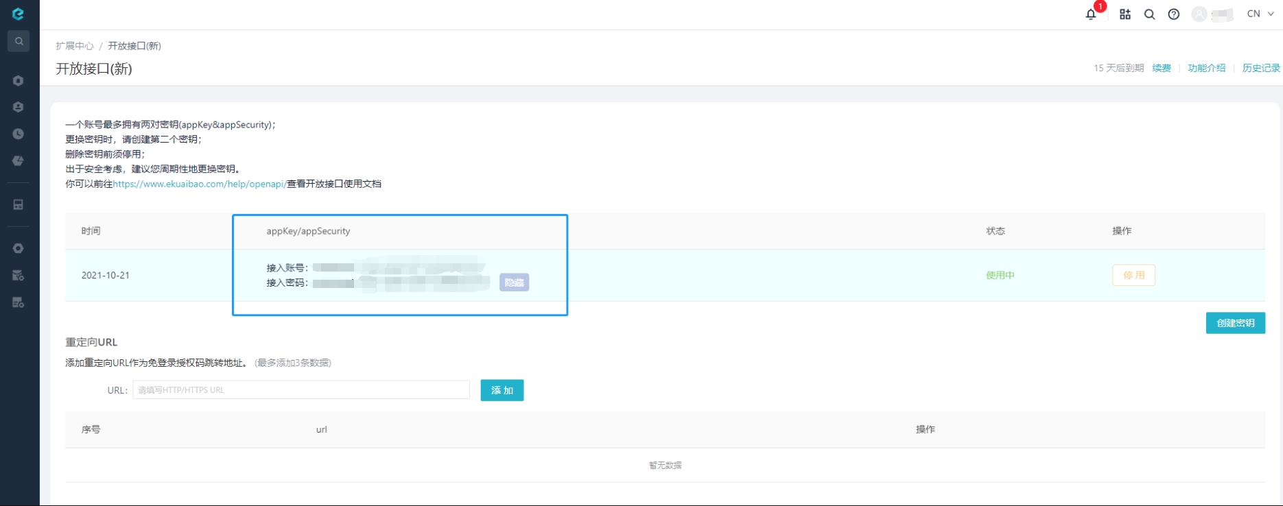 1.4、将刚刚在易快报获取的【appKey】、【appSecurity】,复制到小懿互联应用授权界面,即可成功授权应用。