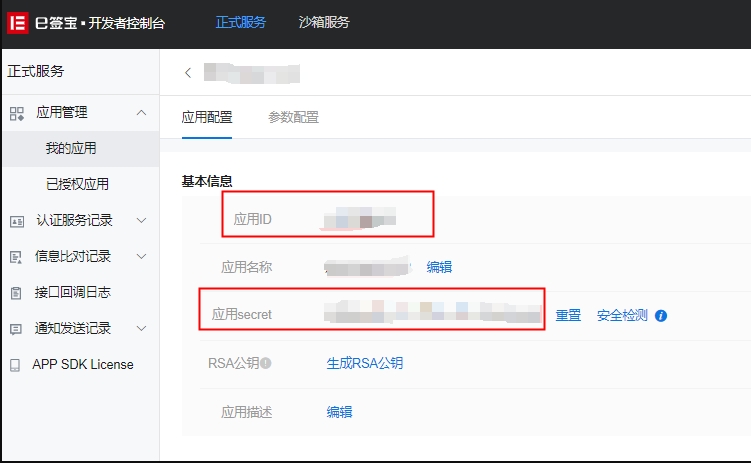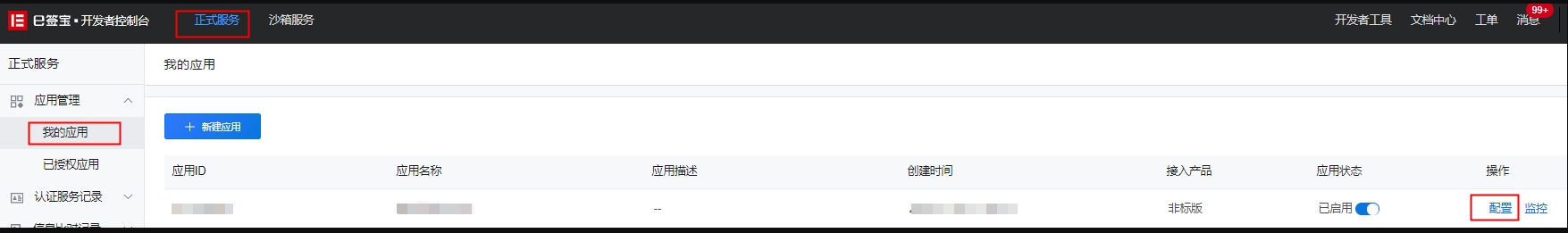 1.1、登录E签宝后台,点击【正式服务】-【应用管理】-【我的应用】后在右侧应用列表页面中找到已创建的应用ID所在行,点击行尾的【配置】即可查看正式应用信息。如下图: