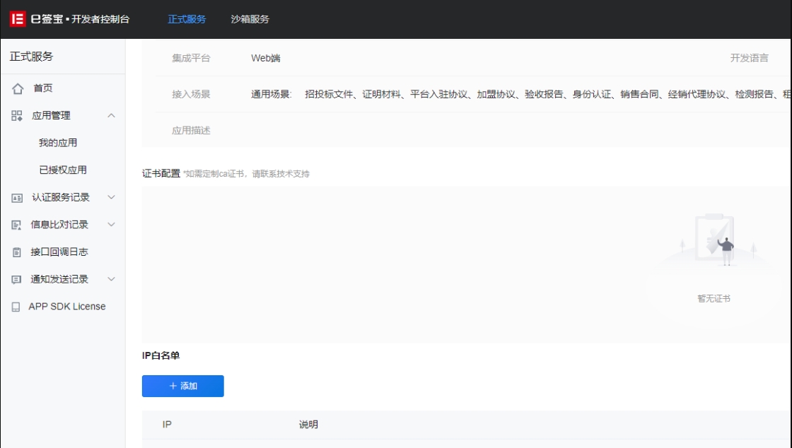 2.1、e签宝在小懿互联授权成功后,需要配置IP白名单。在e签宝后台【应用管理】-【我的应用】应用【配置】中设置。