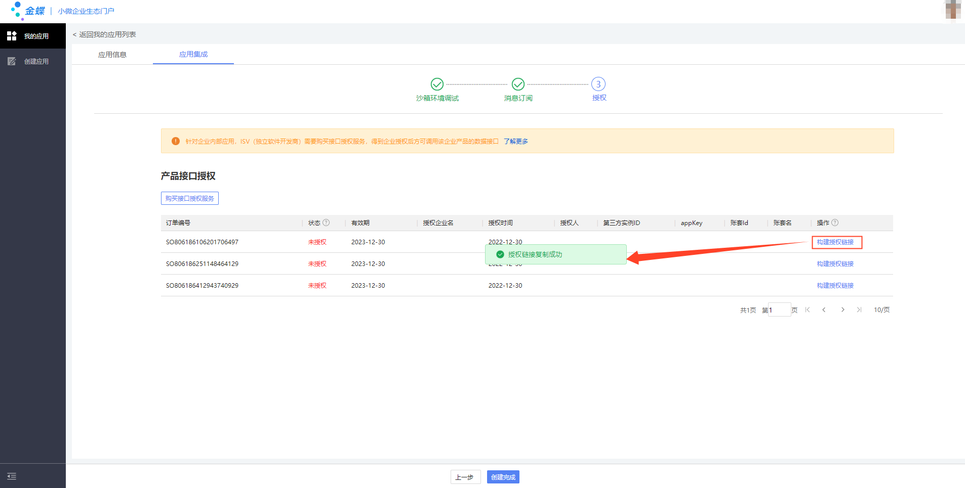 购买成功后,在应用详情-授权页面,可看到该订单,点击构建授权链接,提示授权链接复制成功