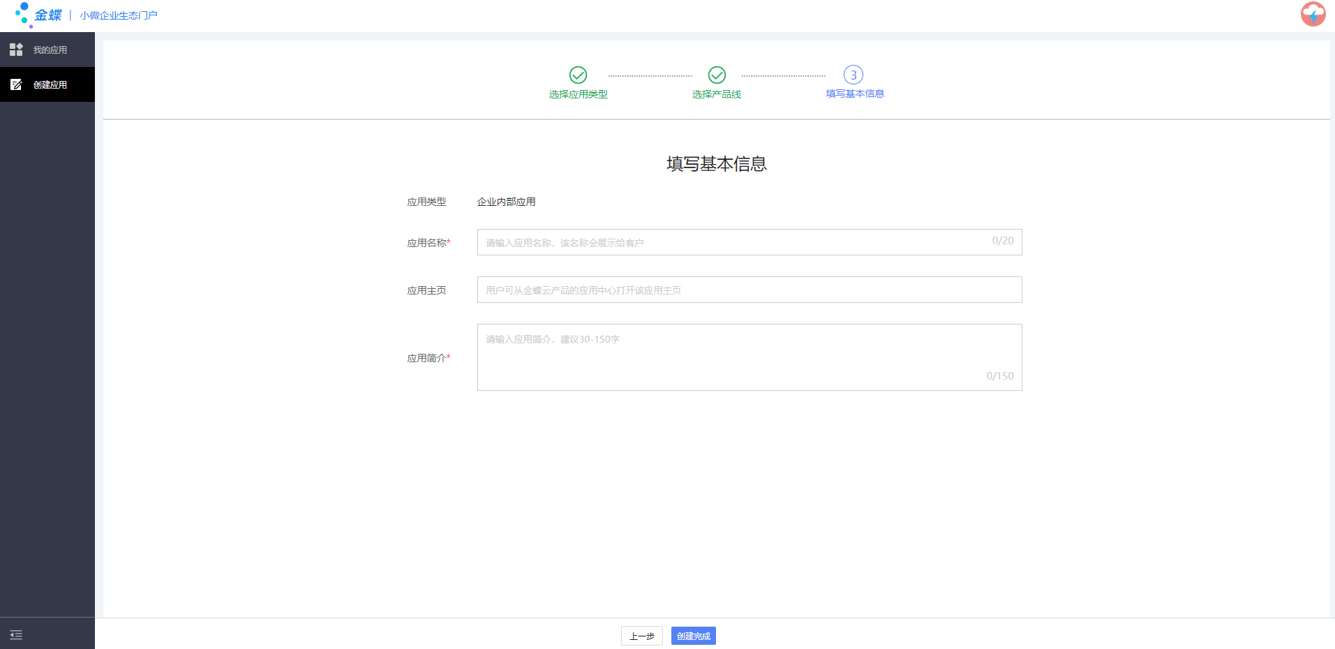 填写应用基本信息。应用名称为该应用的具体名称,应用主页为当前应用的登录主页(可进行浏览器访问的主页,若无则不填写),应用简介为该应用的简要描述。