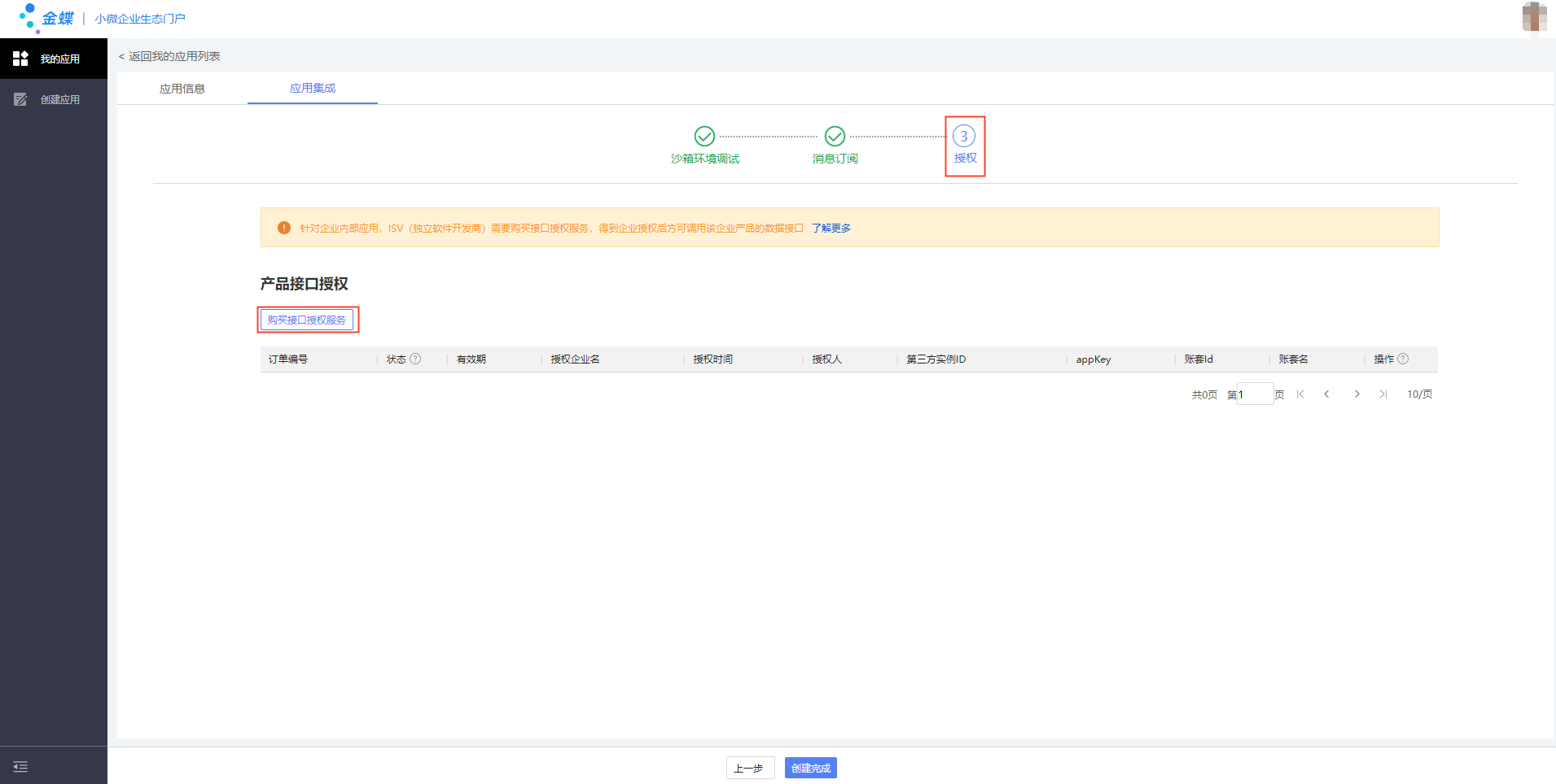 Step 1:购买API授权服务 在【应用详情-授权】页面,点击【购买接口授权服务】