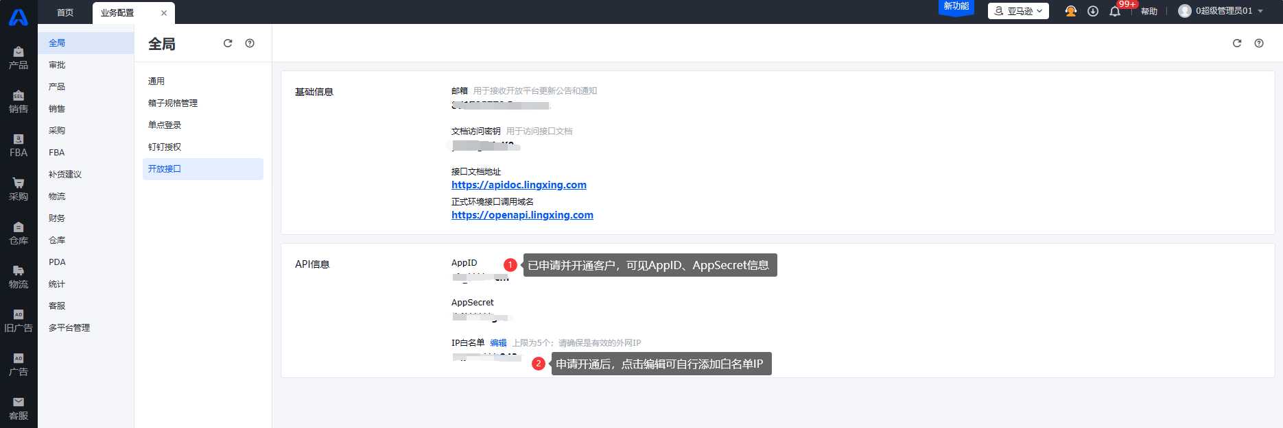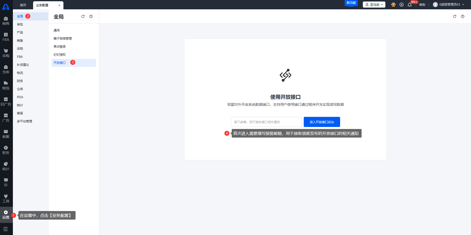 3.1、使用超级管理员账号登录领星ERP,进入【设置】>【业务配置】>【全局】>【开放接口】,输入邮箱用于接收领星开放平台相关通知消息,点击【进入开放后台】按钮。