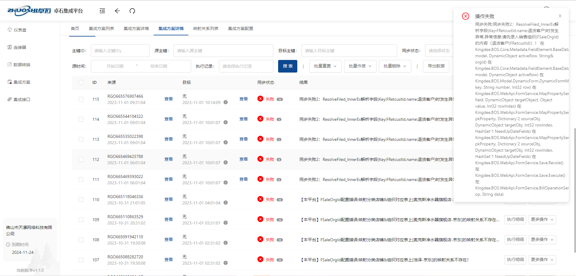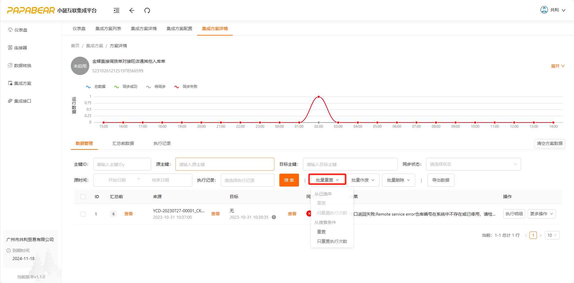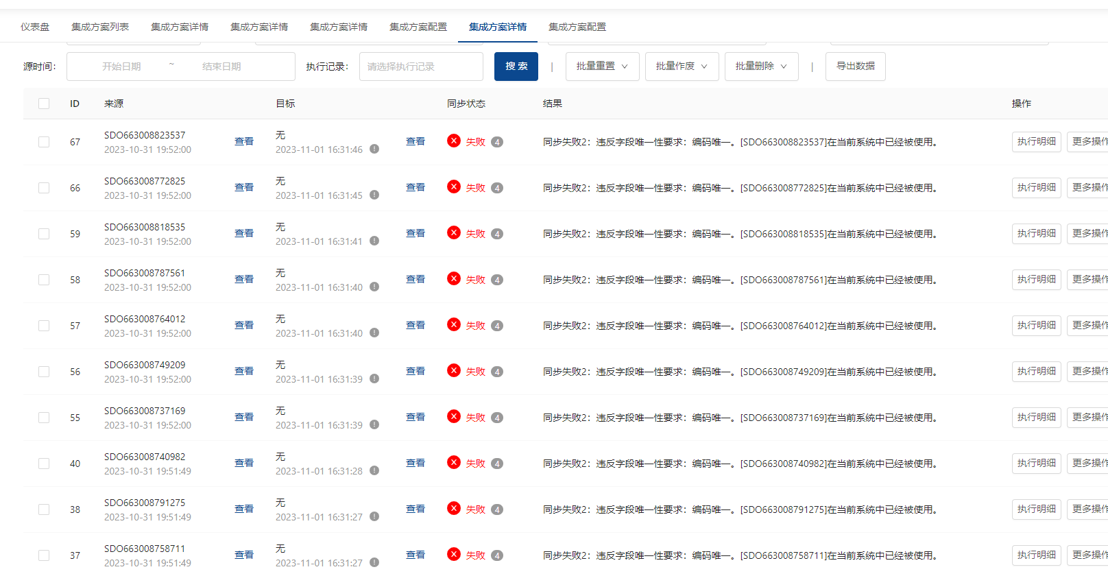解决:若是想要重新传输,需要在目标系统将单据删除,再回到集成平台将单据状态重置(可批量操作; 注:若是只有个别单据,建议只操作个别单据)