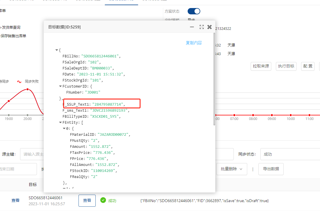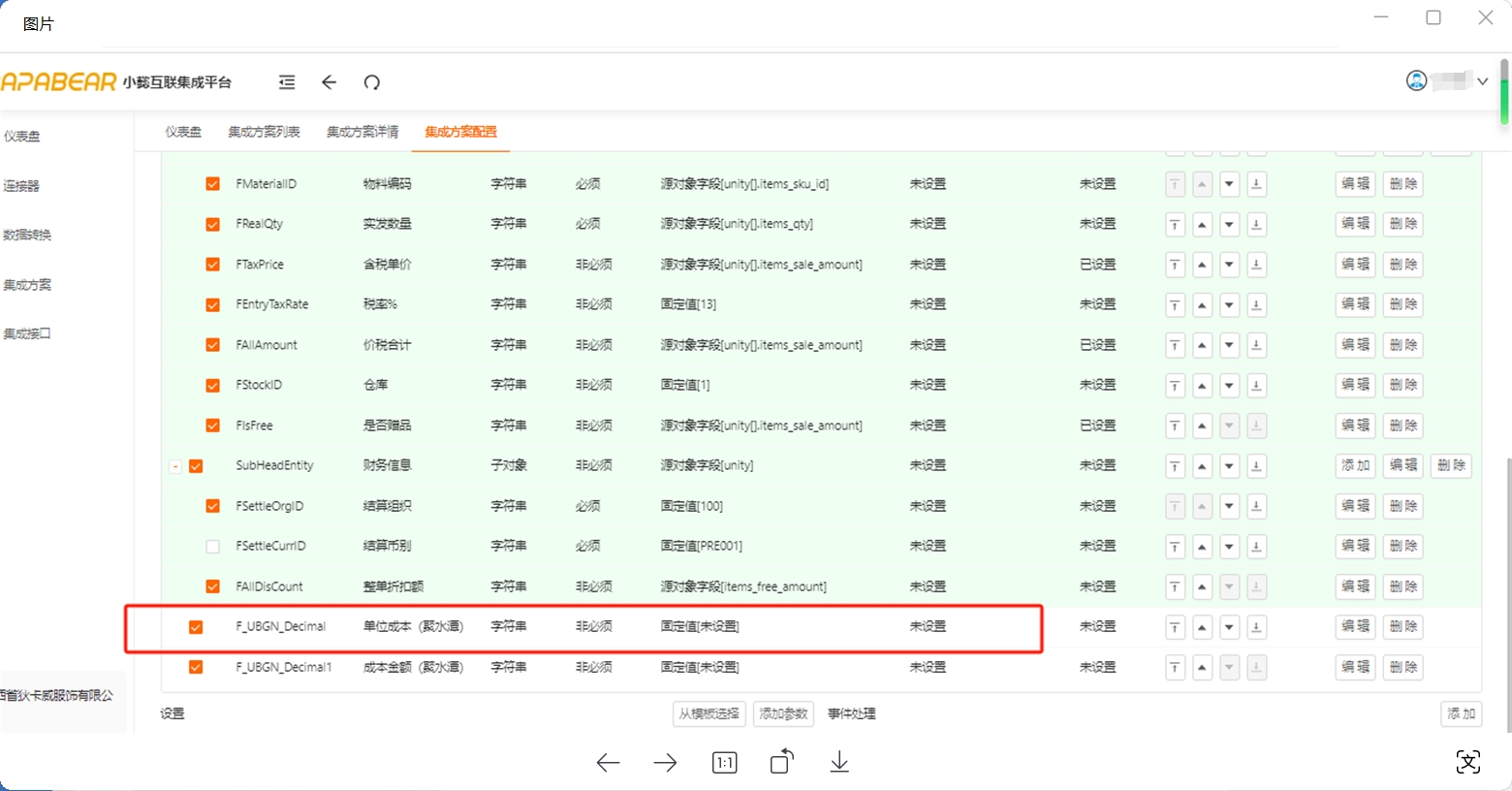 问: 自定义字段已经配置好并且写入json也传输成功了,怎么目标系统(金蝶云)这个字段还是没有值?下图: