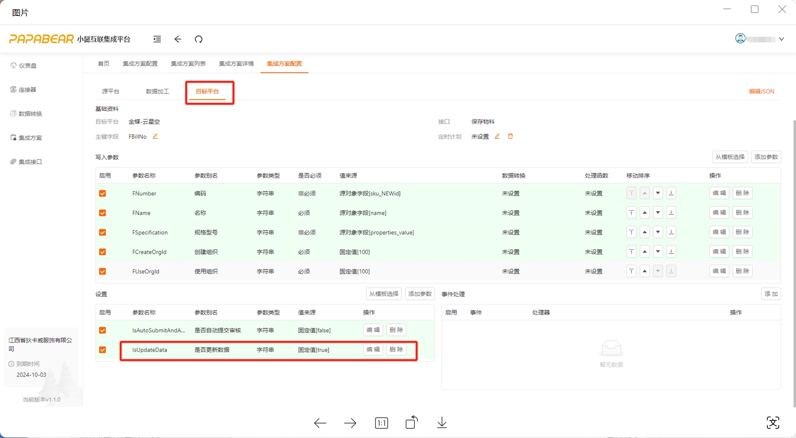 目标平台: 目标平台若是金蝶云星空,需要注意一个是否更新数据的参数,将其设置为【是】、【true】。